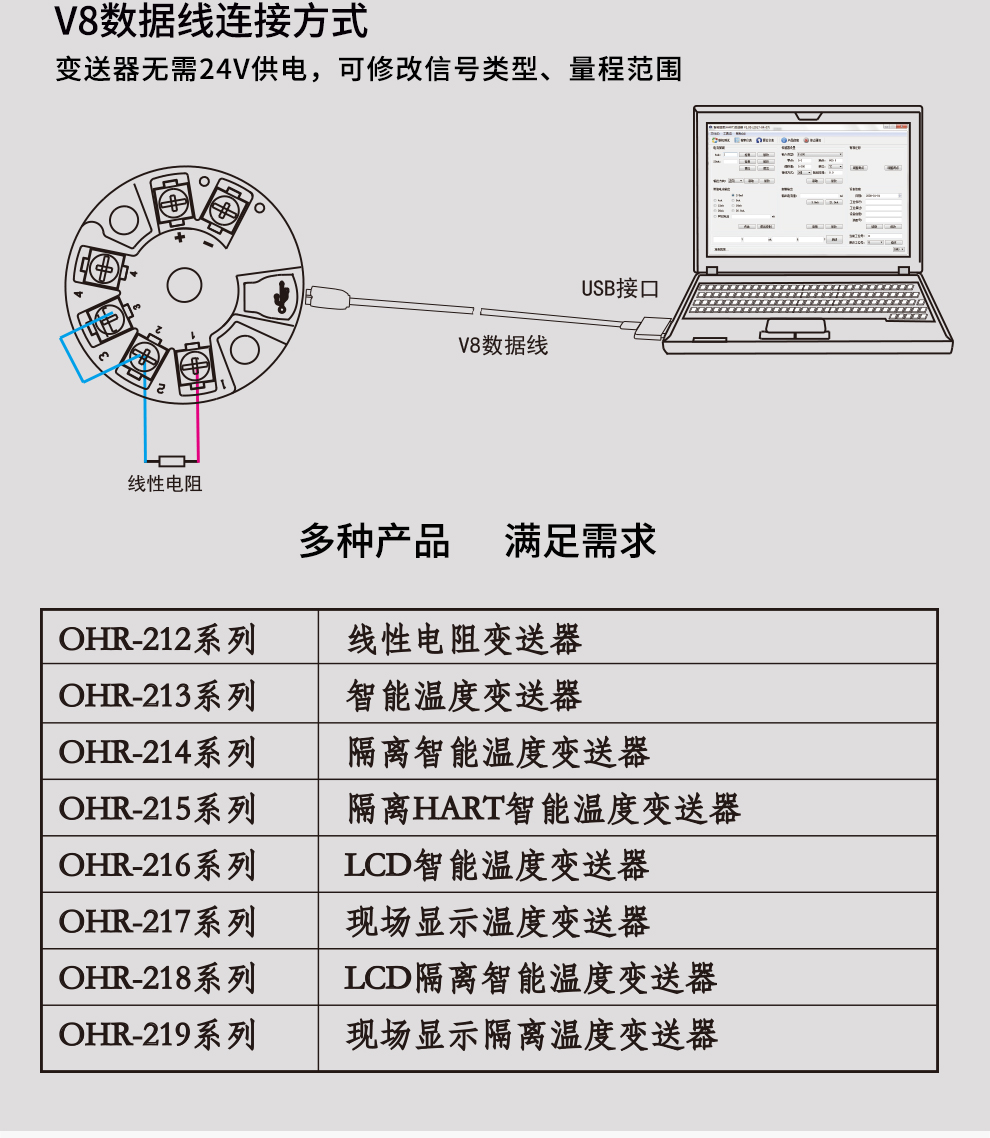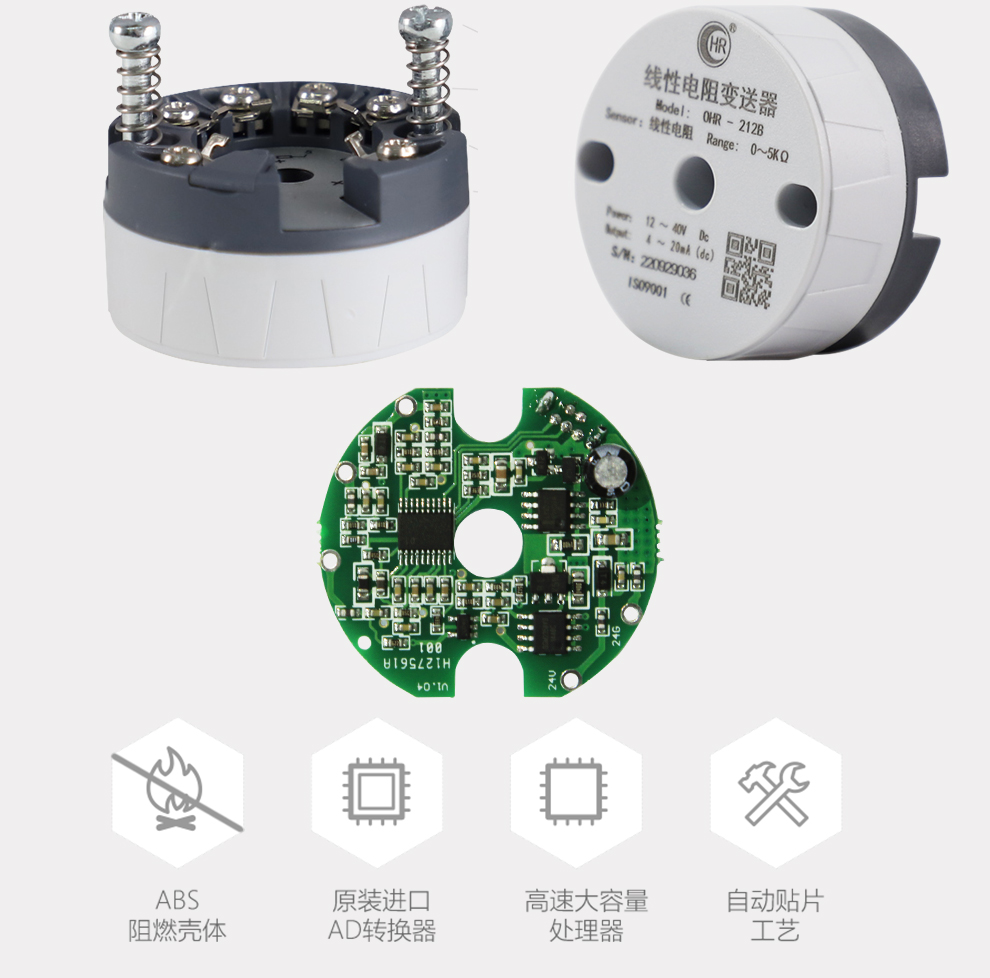 • OHR-212線性電阻(磁翻板)變送器,用于線性電阻信號輸入,二線制4~20mA模擬輸出,安裝于傳感器內部(Form B)。