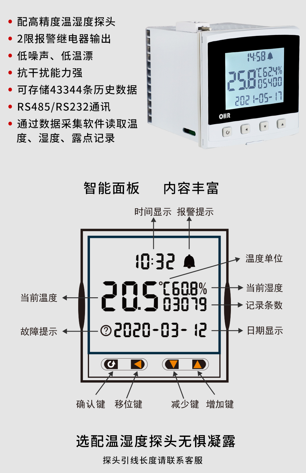 OHR-WS40R系列盤裝式溫濕度記錄儀采用高精度的采集電路及進(jìn)口傳感器,對(duì)環(huán)境的溫濕度進(jìn)行實(shí)時(shí)監(jiān)測(cè)、報(bào)警與記錄。大屏幕液晶顯示器,實(shí)時(shí)顯示溫濕度、時(shí)間與記錄信息;帶串行通訊接口,實(shí)現(xiàn)數(shù)據(jù)通訊;通過(guò)配套的上位機(jī)軟件可查看數(shù)據(jù)詳情。該記錄儀主要用于監(jiān)測(cè)記錄食品、醫(yī)藥品、化學(xué)用品等產(chǎn)品在存儲(chǔ)過(guò)程中的溫濕度數(shù)據(jù),廣泛應(yīng)用于倉(cāng)儲(chǔ)、冷藏庫(kù)、實(shí)驗(yàn)室、養(yǎng)殖孵化、大棚種植等。